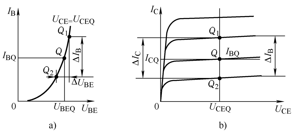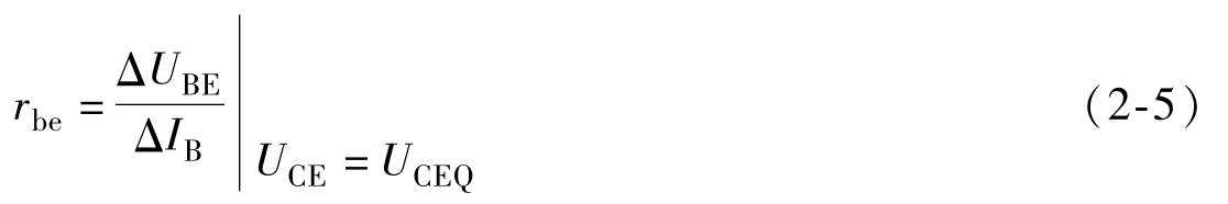 如图2-11a所示,虽然晶体管的输入特性曲线是非线性的,但 U BE 在 Q 点附近小范围内变化时,可以得到Δ U BE 的微小电压变化量,这个变化量在 Q 1 和 Q 2 之间的输入特性曲线近似为一条直线。当 U CE = U CEQ 时,电压变化量Δ U BE 与电流变化量Δ I B 成正比,即