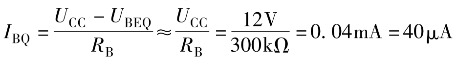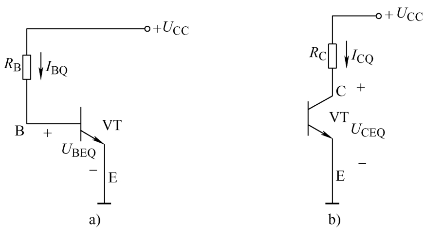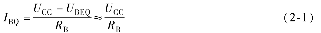 图2-5a所示电路为 I BQ 的计算电路。 I BQ 称为基极偏置电流,是流过电阻 R B 后流入晶体管的基极电流,由基尔霍夫电压定律可知, U CC = I BQ R B + U BEQ ,可得