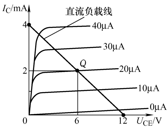 放大电路输出的直流负载线如图2-8所示,这条直线与 I BQ =20μA的交点就是静态工作点 Q , Q 点的 I CQ =2mA、 U CEQ =6V。