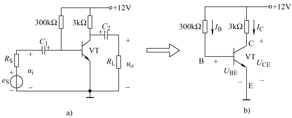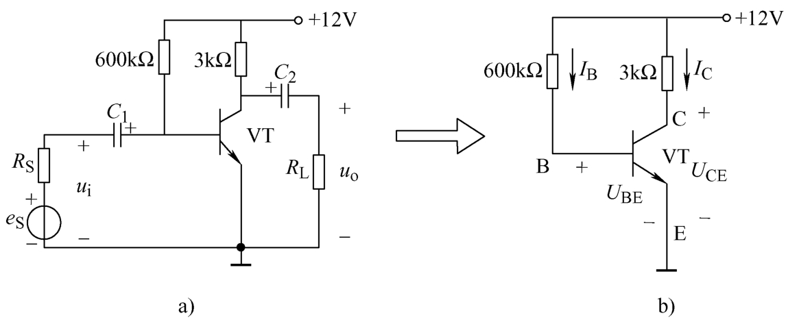 a) I BQ 的计算电路 b) U CEQ 的计算电路