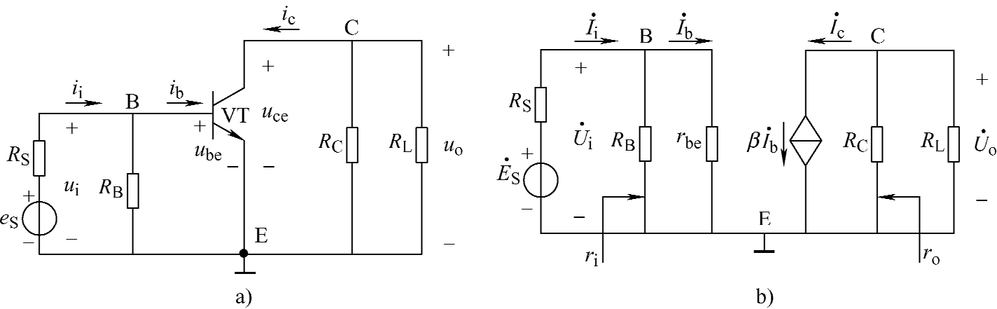 在晶体管的微变等效模型的基础上,就可以把图2-13a转换成如图2-13b所示的晶体管共发射极放大电路的微变等效电路。晶体管放大电路的动态性能指标主要有:输入电阻 r i 、输出电阻 r o 和电压放大倍数 A u 。