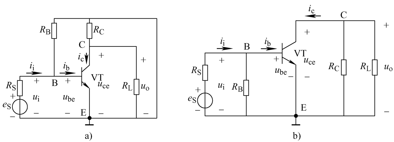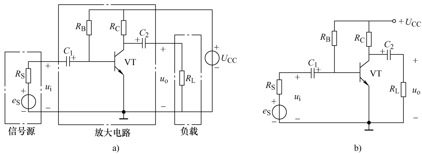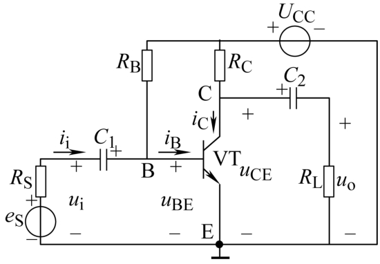 在放大电路中,通常把公共端接“地”,设其电位为零,作为电路中其他各点电位的参考点;信号源接到放大电路输入端, e S 是交流信号源,作为待放大信号, R S 信号源内阻,输入电压为 u i ; u i 经放大后在负载 R L 两端得到输出电压 u o 。