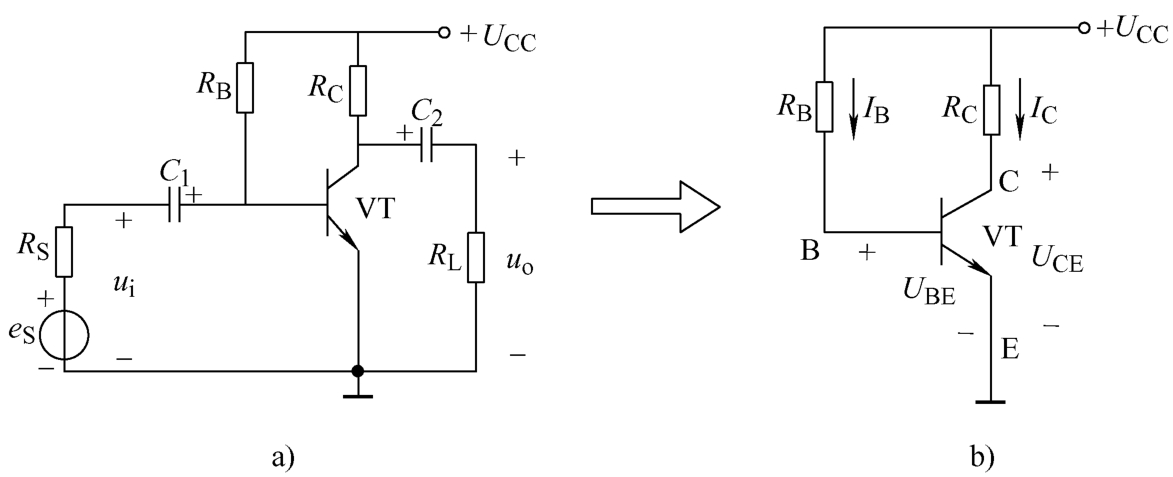 当放大电路处于静态时,电容视为开路,电感视为短路,电路中只有直流流过的路径称为放大电路的直流通路。图2-4a所示的共发射极放大电路的直流通路如图2-4b所示,图中的电压、电流用直流分量的符号可表示为 I B 、 I C 、 U BE 和 U CE 。