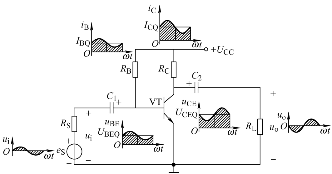 综上所述可得:共发射极放大电路的输入端从信号源 e S 获得按正弦规律变化的输入电压 u i ,经电容C 1 耦合到晶体管的基极,与静态基极电流叠加成 i B , i B 的变化使集电极电流 i C 随之变化,进而在集电极电阻 R C 上产生压降,集电极电压 u CE = U CC -i C R C , u CE 的变化与 i C 的变化相反。 u CE 中的交流分量经过C 2 耦合到输出端获得与输入电压 u i 反向的输出电压 u o 。共发射极放大电路中各点的电压电流波形如图2-17所示。