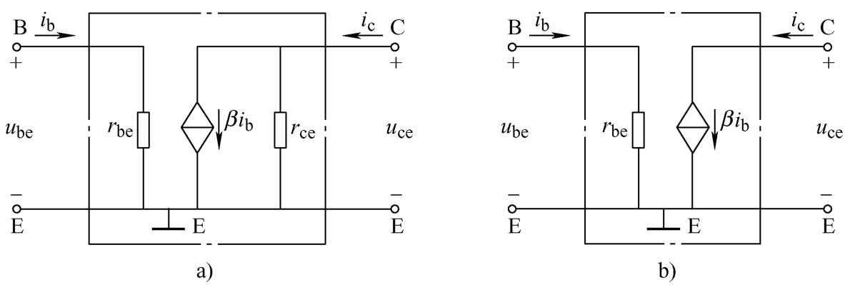 在小信号的作用下, r be 是一常数,它是确定交流分量 u be 和 i b 之间关系的动态电阻。因此,晶体管的输入端口(B和E之间)可用 r be 来等效代替;在晶体管的输出特性曲线组中,放大区内输出特性曲线可近似看作一簇等距离的平行直线。当 U CE = U CEQ 时,在Δ U BE 的作用下,会产生的电流变化量Δ I B 和Δ I C ,变化量Δ I B 和Δ I C 之比即为晶体管的电流放大系数 β 。在小信号的作用下, β 是一常数,它表明 i c 受 i b 的控制,即可等效成一个受 i b 控制的受控电流源,如图2-12a所示。