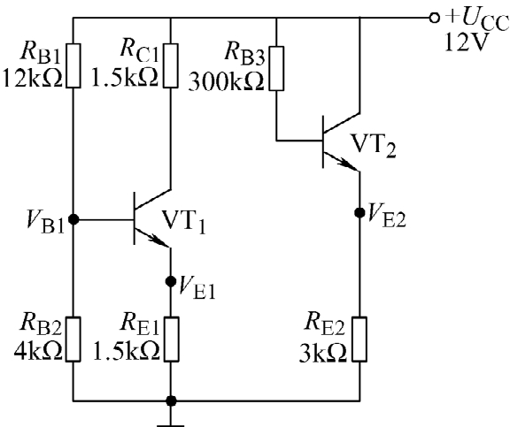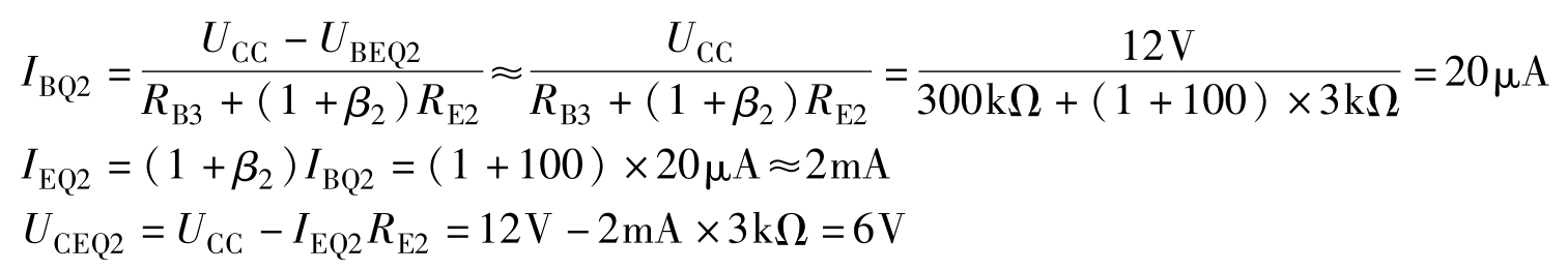【 例2-6 】电路如图2-34所示的阻容耦合放大电路中,其中 β 1 =100、 β 2 =100,忽略 U BEQ1 和 U BEQ2 ,请根据图中所标注的参数试计算各级静态工作点。