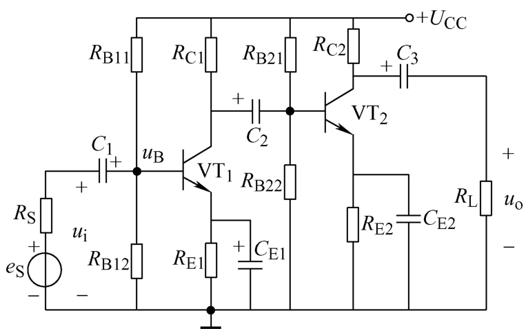 【 例2-5 】电路如图2-32所示的阻容耦合两级放大电路中,其中 β 1 =100、 β 2 =60、 U CC =24V、 R B11 =36kΩ、 R B12 =24kΩ、 R C1 =2kΩ、 R E1 =2.2kΩ、 R B21 =33kΩ、 R B22 =10kΩ、 R C2 =3.3kΩ、 R E2 =1.5kΩ、 r be1 =0.96kΩ、 r be2 =0.8kΩ、 R S =360Ω、 R L =5.1kΩ。求:1)各级的输入电阻和输出电阻。2)放大器的放大倍数 A u 。3)放大电路的输入电阻 r i 和输出电阻 r o 。