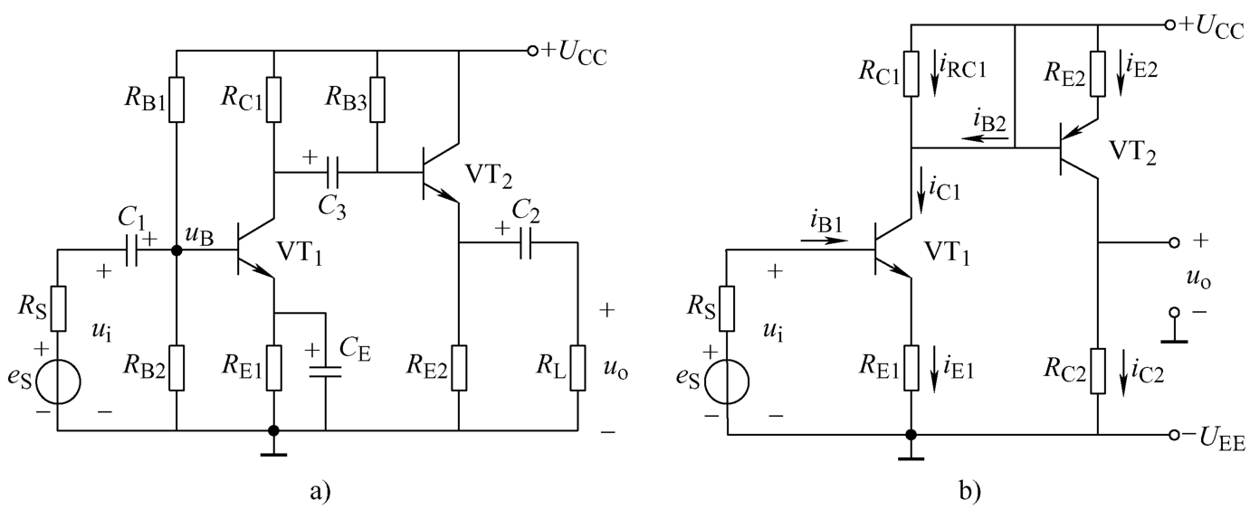 如图2-30b所示为直接耦合多级放大电路,这种电路既能放大交流信号,也能放大变化缓慢的直流信号,便于集成化。直接耦合多级放大电路前后级之间存在着直流通路,各级静态工作点相互影响,存在零点漂移问题,这部分内容将在后面章节涉及时再进行具体分析。