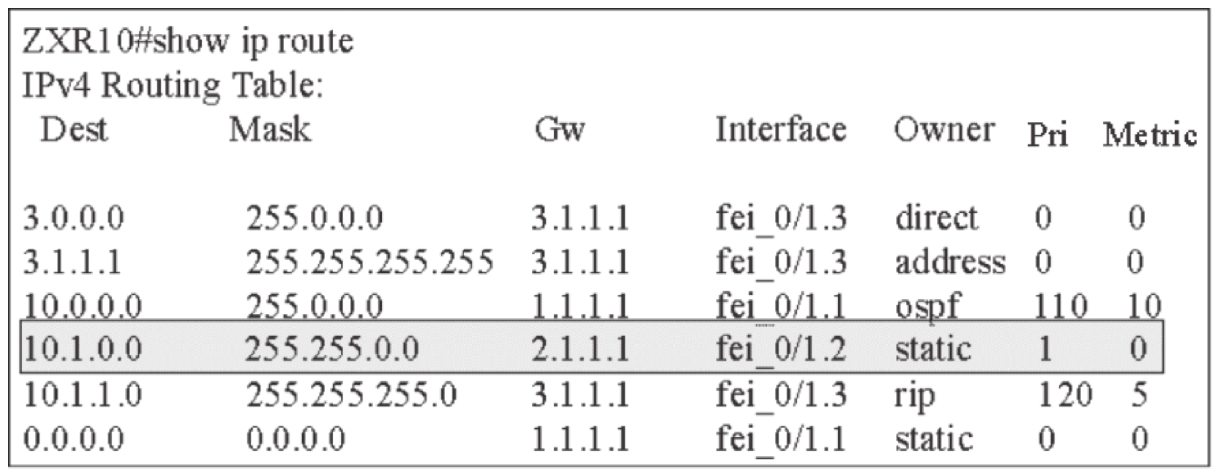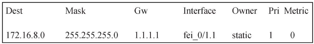 图3-1中的路由信息的含义为:到达子网172.16.8.0/24的下一跳地址为1.1.1.1,本地输出接口为fei_0/1.1,本条路由是由static方式产生的,路由优先级为1,Metric值为0。