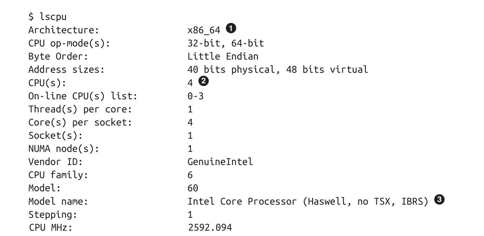 在前面的命令中,我们看到CPU架构报告为x86_64,模型报告为“Intel Core Processor(Haswell)”。我们将在稍后学习更多关于如何解码的内容。
