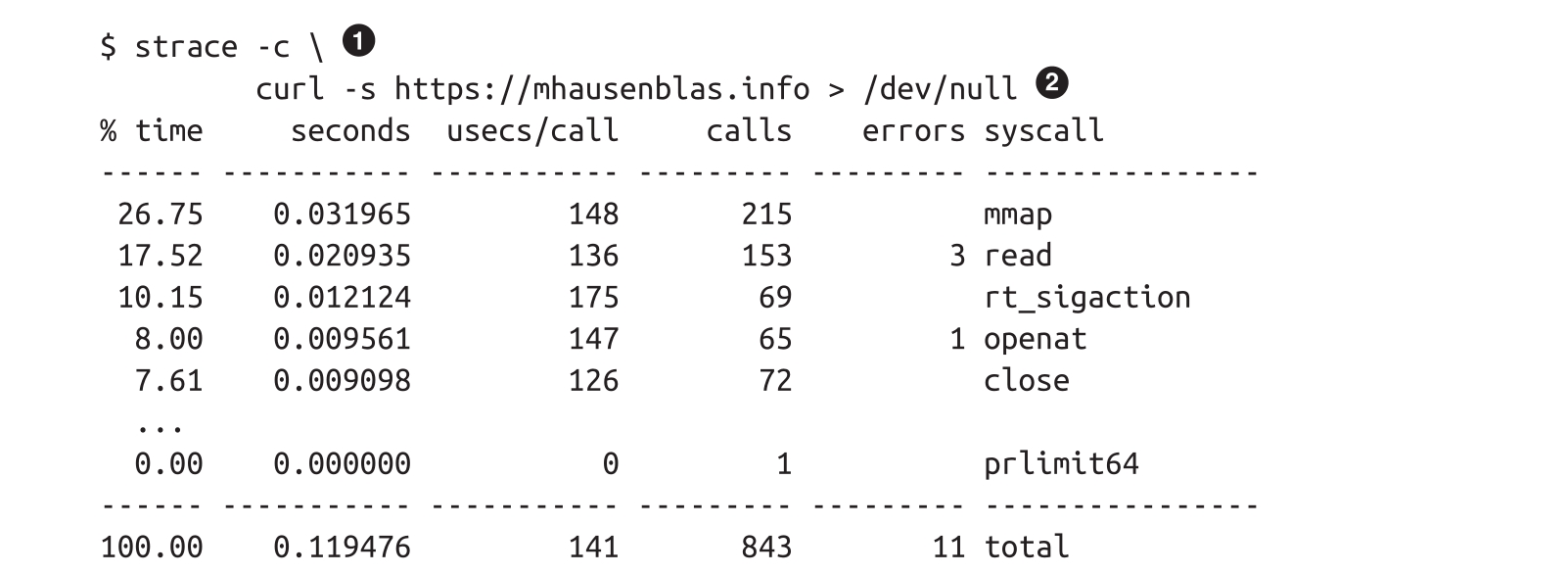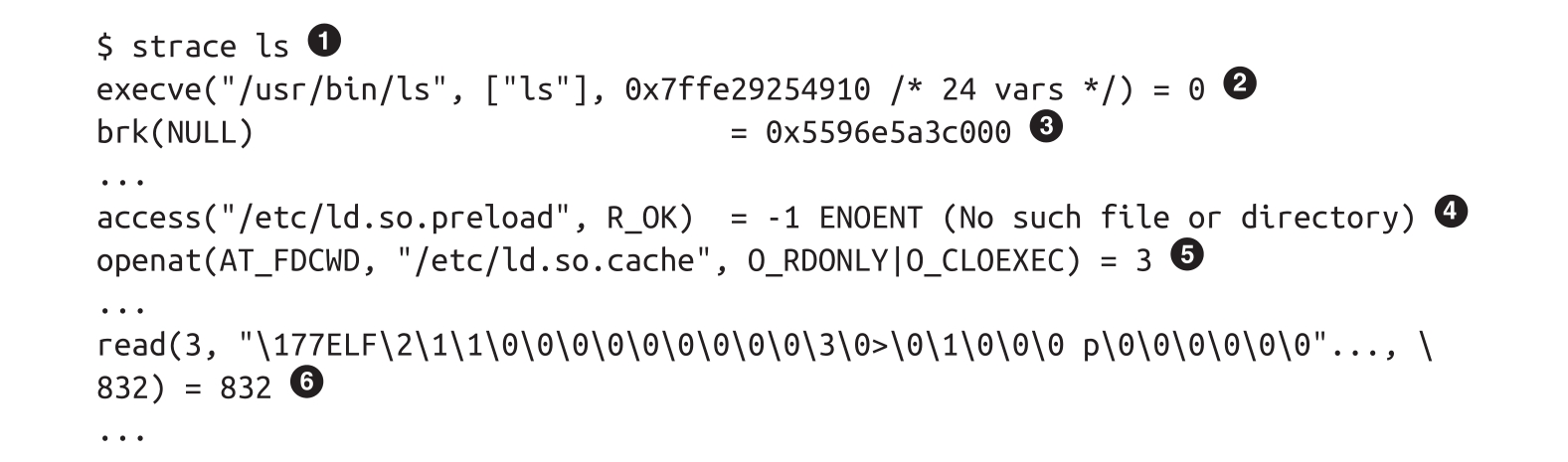 ❶对于strace ls,我们要求strace捕获ls使用的系统调用。注意,我编辑了输出,因为strace在我的系统上生成了大约162行(这个数字因发行版、架构和其他因素而异)。此外,你在这里看到的输出来自stderr,因此如果你想重定向它,你必须在这里使用2>。你将在第3章学到更多。