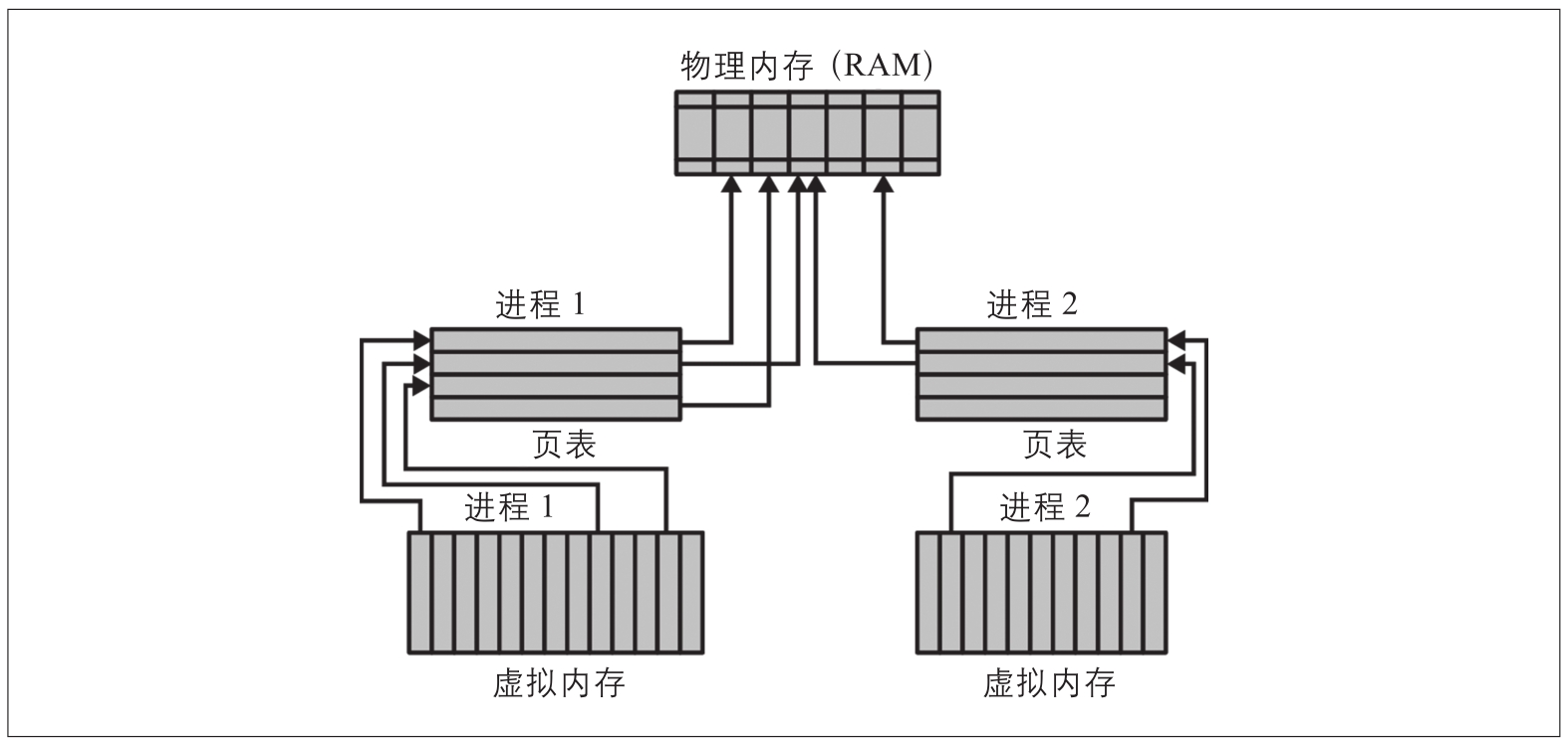 多个虚拟页可以通过各自的进程级页表指向同一个物理页。在某种意义上,这就是内存管理的核心:有效地为每个进程提供其页面实际存在于RAM中的假象,同时优化地使用现有空间。