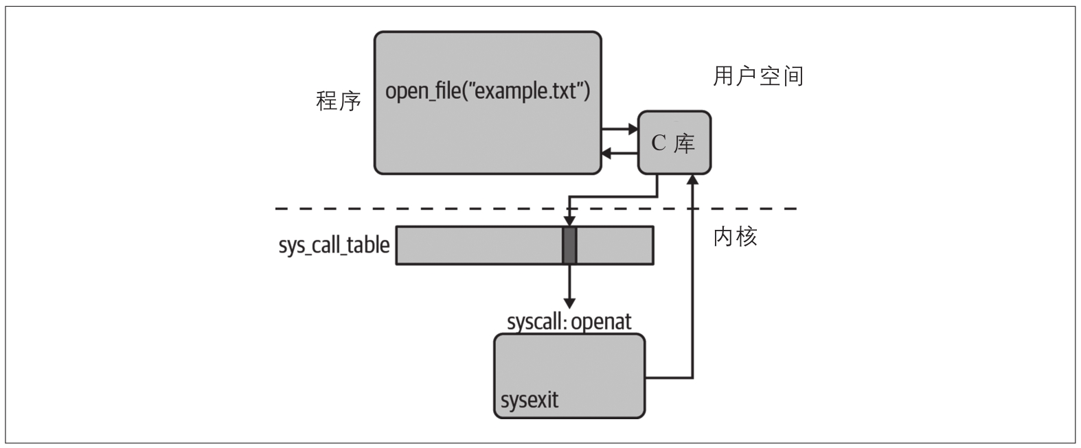 无论你坐在终端前,输入touch test.txt,还是你的某个应用程序想要从远程系统下载文件的内容,最终你都需要Linux将高级指令(如“创建文件”或“从某地址读取所有字节”)转换为一组具体的、依赖于架构的步骤。换句话说,内核公开的服务接口和用户空间实体调用是系统调用的集合,或者简称为syscall( https://oreil.ly/UF09U )。