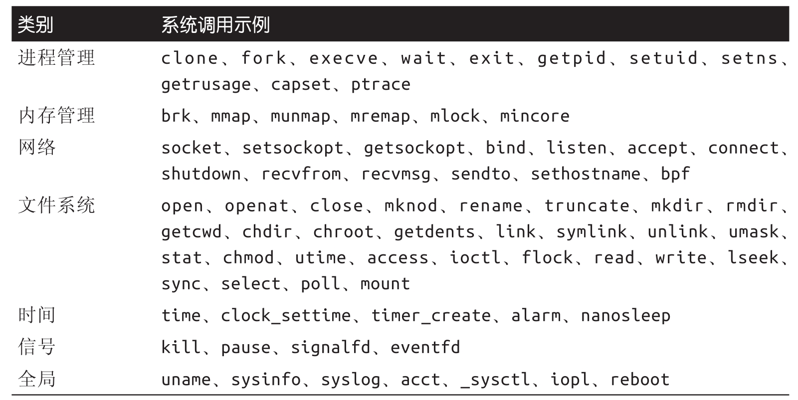 为了帮助你了解覆盖范围,表2-1列出了在内核组件和系统范围内广泛使用的系统调用示例。你可以通过手册页( https://oreil.ly/qLOA3 )的第2部分查看系统调用的详细信息,包括它们的参数和返回值。