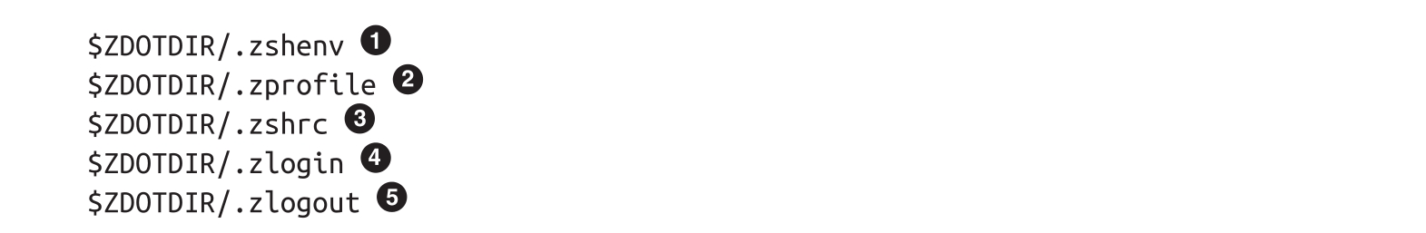 zsh使用5个启动文件,如下例所示(注意,如果没有设置$ZDOTDIR,则zsh将使用$HOME):