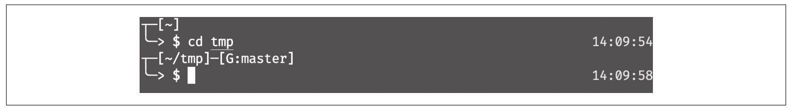 上述提示定义产生如图3-7所示的提示。注意包含Git repo和不包含Git repo的目录之间的区别,这是一个内置的视觉提示,可以加快你的流程。另外,请注意右侧的当前时间。