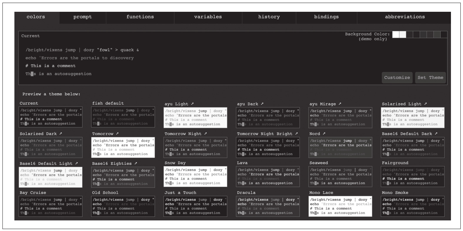 要配置Fish shell( https://oreil.ly/FCSne ),你只需输入fish_config命令(你可能需要添加browse子命令,这取决于你的发行版),fish将通过 http://localhost:8000 启动服务器,并自动打开默认浏览器,显示一个漂亮的UI,如图3-6所示,它允许你查看和更改设置。