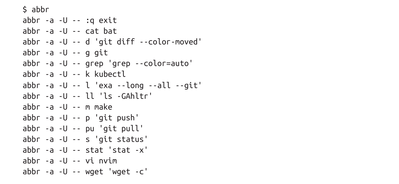 我的缩写——可以把它们看作alias的替代,就像在其他shell中发现的那样——如下所示: