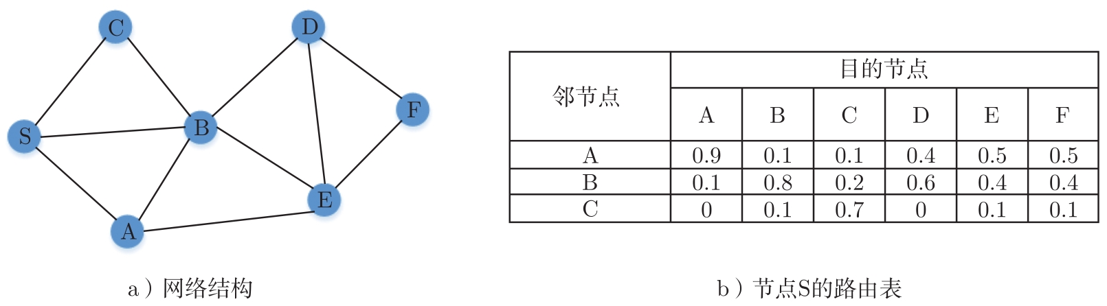 例2.1.7 Ant-Based Control(ABC)算法 [16] 使用蚂蚁作为探索智能体,遍历网络节点并更新路由指标(信息素)来实现智能体间接通信。ABC算法综合考虑路线的长度和沿线的拥挤程度来选择路由,两种路由任务分别是进行概率决策的探索蚂蚁和做出确定性决策的实际调用(选择目的地对应列中信息素最多的链路)。每个源节点S都会发出许多探索蚂蚁,这些蚂蚁都朝着随机选择的目的地D前进,到达D时从网络中删除。网络结构及节点路由表如图2-3所示。在节点路由表中,行包括所有邻节点,列包括所有可能的目的地,每个条目都对应于特定邻节点指向特定目的地的链路上的信息素量,这些信息素量在每一列中归一化,可以作为选择最佳链路的概率。