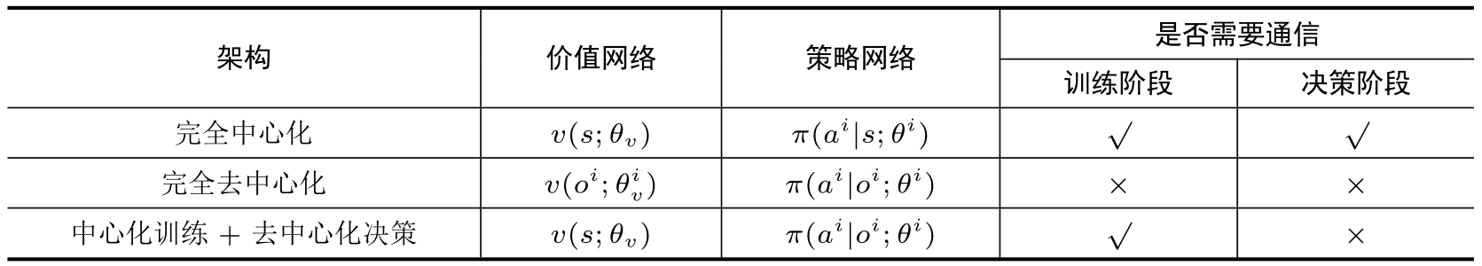 表2-1汇总了多智能体强化学习中的3种组织架构及是否需要通信。