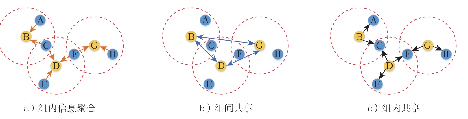 例2.3.6 LSC(Learning Structured Communication)算法 [26] 采用基于群组的分层通信结构,组内信息聚合是群组低级智能体与高级智能体之间通信时,由高级智能体将群组内的所有信息聚合,形成本群组对于环境的感知;组间共享是不同群组的高级智能体通信,从而形成对环境的全局感知;组内共享是群组内的高级智能体将获取到的信息与低级智能体进行共享,如图2-6所示。