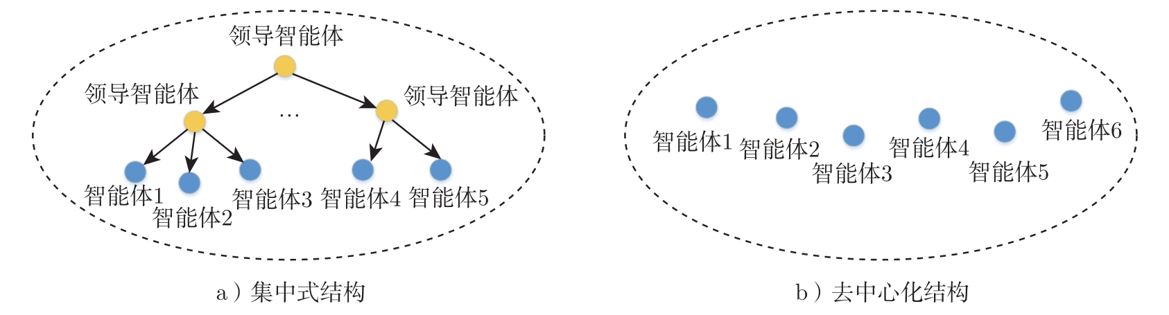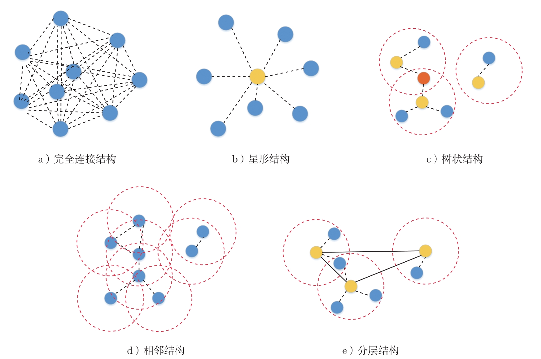 ❑ 完全连接结构。智能体需要与其他所有智能体进行通信,当智能体数量较大时需要高带宽。