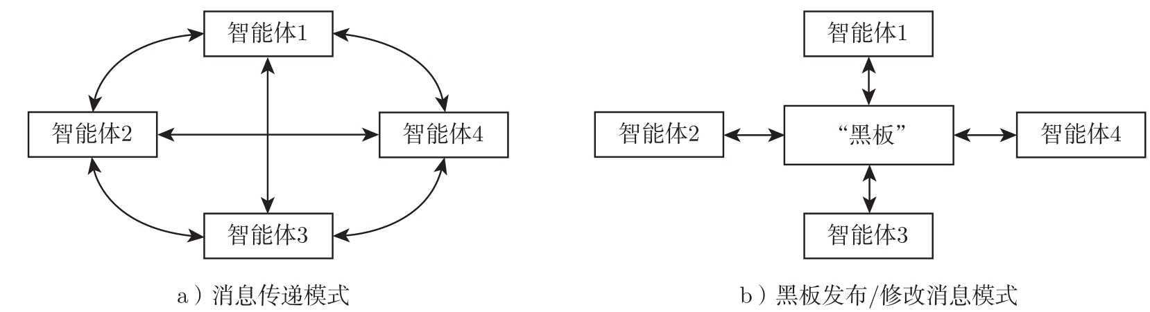 以消息对话形式在智能体之间直接传递信息,但当智能体数目很大时,通信传输开销很高,并且需要考虑实现的复杂性。它包括点对点方式、广播方式。