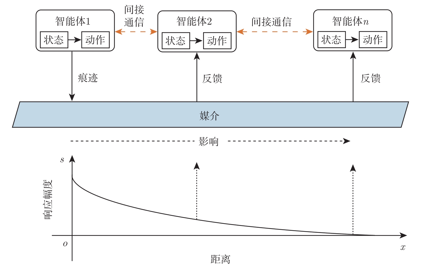 具有共识主动性的智能体根据局部状态选择动作后会在环境中留下痕迹,以影响其他智能体的状态。媒介是充满痕迹的指定空间,如数字信息素地图,响应幅度取决于具有共识主动性智能体之间的距离 x 和痕迹在媒介中的强度。