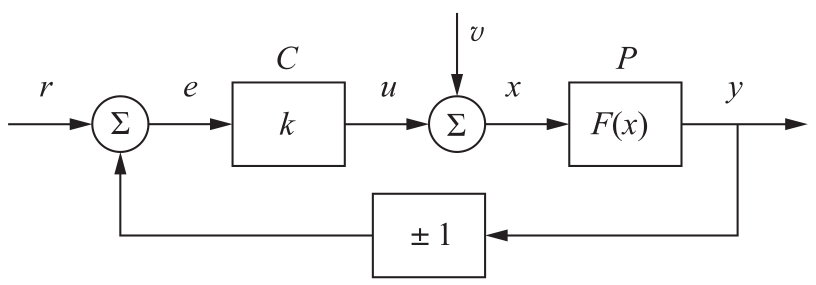 图2.1 简单的静态反馈系统框图。控制器恒定增益 k >0,过程用非线性函数 F ( x )建模。过程输出为 y ,控制信号为 u ,外部信号为参考 r ,负载干扰为 v 。底部方块中的“+”“-”符号分别表示正反馈和负反馈