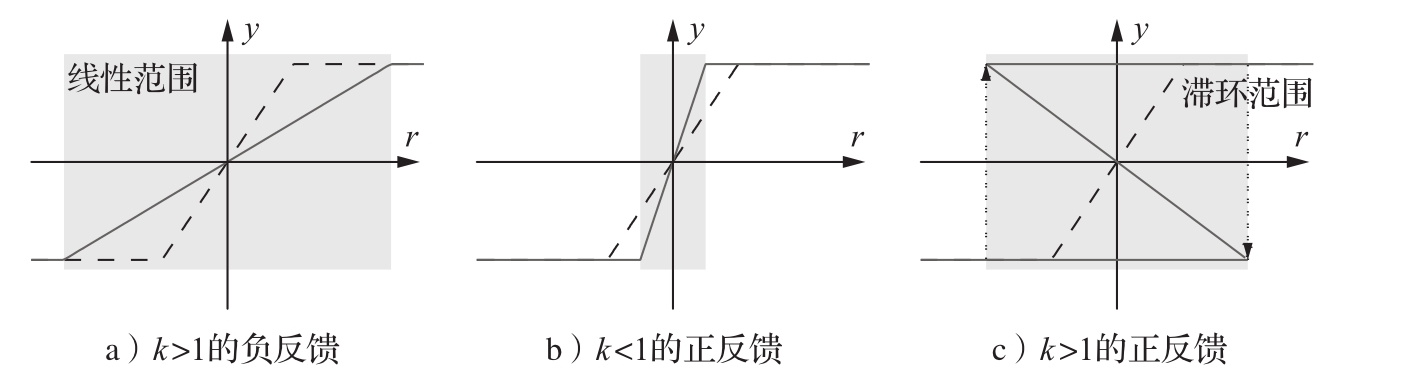 综合以上三种情况的分析可见,负反馈增大了系统的线性范围,降低了系统对参数不确定性的灵敏度,并减轻了负载干扰的影响。付出的代价是降低了闭环增益。正反馈正好相反:它使闭环增益增大,但付出的代价是增大了灵敏度,放大了干扰的影响。