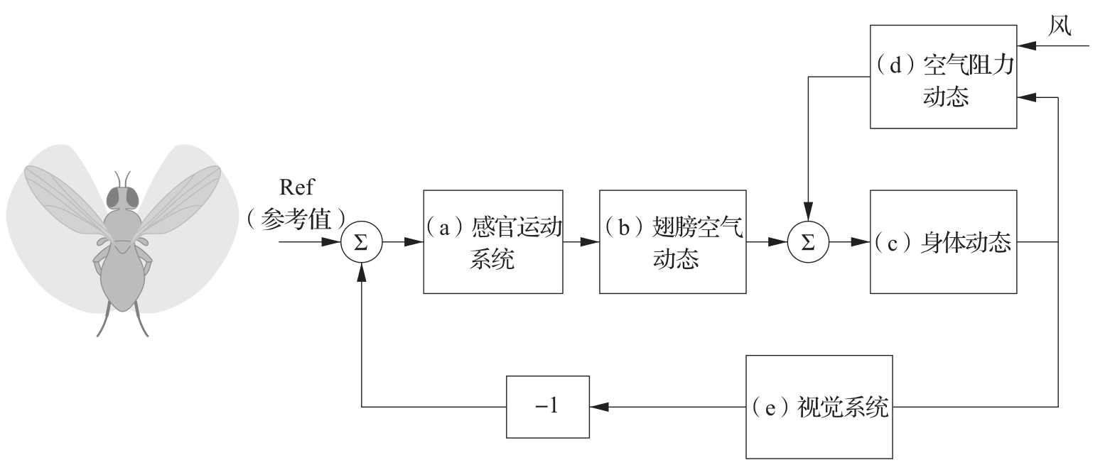 图3.15 逆风飞行的昆虫飞行控制系统的框图表示。模型的力学部分由苍蝇的刚体动态、在空气中飞行的阻力和翅膀扇动产生的力等组成。身体的运动引起苍蝇的视觉环境变化,这个信息被用于控制翅膀的运动(通过感官运动系统),从而形成闭环