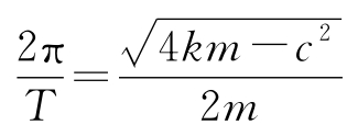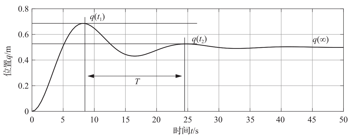 式中, F 0 是所施加外力的幅值(对于单位阶跃输入, F 0 =1)。参数1/ k 称为系统的 增益 (gain)。振荡周期可以由两个峰值间的距离测得,它必须满足: