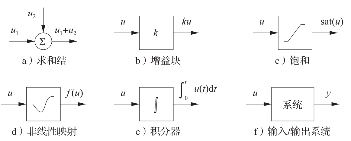 图3.14 标准框图的元件。箭头指明每个元件的输入和输出,相应的数学运算则标在元件的输出上。图f所示的系统方块元件表示一个动态系统的全部输入/输出响应