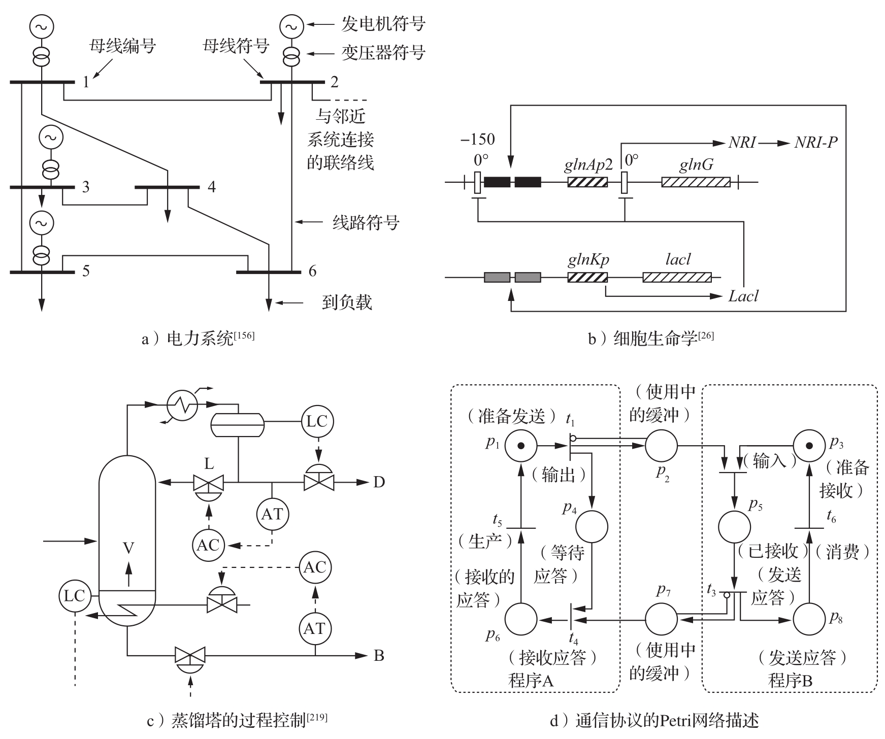 要处理大型、复杂的系统,最好对系统进行不同的表示,以捕获系统的基本特征而隐藏不相关的细节。在所有的科学和工程分支中,常用的做法是采用系统的某些图形描述,即原理图(schematic diagram)。图形描述的范围很广,可以是风格各异的图片,也可以是大大简化的标准符号。这些图片既可以给出系统的全貌,又可以辨识单个的元件。图3.13给出了这种原理图的一些例子。原理图之所以有用,是因为它们在给出系统全貌的同时,还能显示出不同的子过程、它们之间的互联,并指示出可以调节的变量和可以测量的信号。