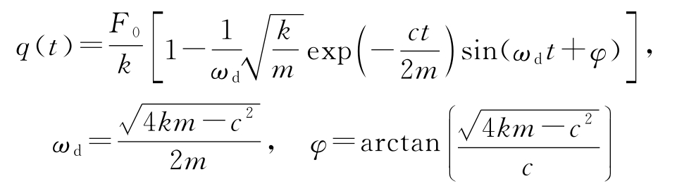 为了确定常数 m 、 c 以及 k ,给系统施加一个幅值为 F 0 的阶跃输入,测量其响应。