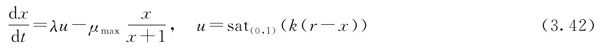 这里的控制器为带饱和的简单比例控制,饱和函数sat ( a , b ) 由式(4.10)定义, r 是期望的队列长度(参考值)。请证明:这个控制器可以降低高峰时间效应。并解释 r 的选择如何影响系统的动态。