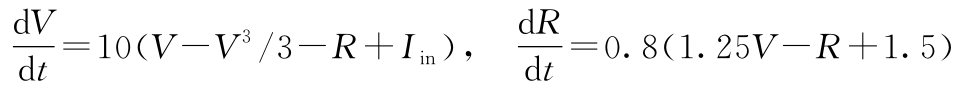 是例3.19中讨论的Hodgkin-Huxley方程的简化版本。其中变量 V 是穿过轴突膜的电压, R 是一个辅助变量,它近似表示流过轴突膜的好几个离子电流的影响。仿真以上方程,重现图3.28中的仿真结果。探讨输入电流 I in 的影响。