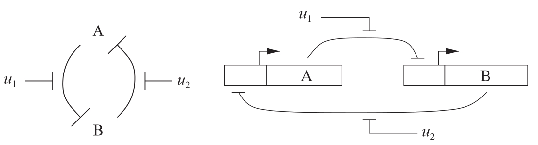 3.10 (生物逻辑开关)如下图所示,将两个抑制子连接成一个环,可以构成一个基因开关。
