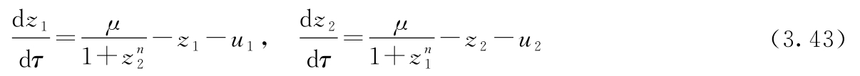 式中, z 1 和 z 2 是经过标度的蛋白质浓度,此外时间的比例也做了改变。证明:对于例3.18中的参数,可得 μ ≈200。并用仿真说明系统的类开关行为。