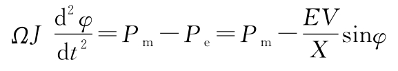 式中, Ω 是转子的机械角速度,可近似看成常数; J 是发电机的有效转动惯量; φ 是旋转角; P m 是驱动发电机的机械功率; P e 是发出的有功功率; E 是发电机的电压; V 是电网电压; X 是线路的电抗。假定电路的动态过程比转子的动态过程快得多, P e = VI =( EV / X )sin φ ,其中 I 是与电压 E 同相位的电流分量, φ 是电压 E 和 V 之间的相位角。试证明:发电机的归一化动态模型跟支点受力的单摆的归一化动态模型具有相同的形式。