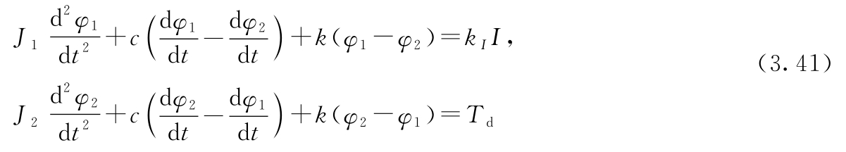 式中, φ 1 和 φ 2 是两个质量块的角位置; ω i =d φ i /d t 是它们的速度; J i 为转动惯量; c 为阻尼系数; k 为轴刚度; k I 是电动机的转矩常数; T d 是施加在轴端的干扰转矩。对于具有柔性臂的机器人、DVD和光盘臂的驱动,也可以得到类似的方程。