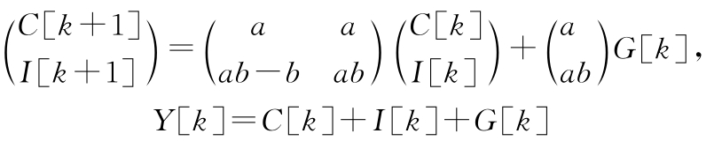 式中, a 和 b 为参数。第一个方程意味着消费随GNP增长,但存在滞后效应;第二个方程意味着投资正比于消费的变化率。