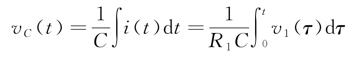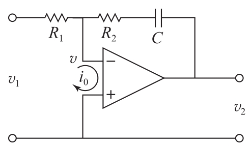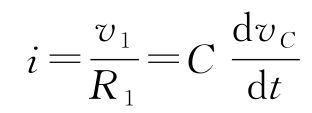 为了建立该电路的简单模型,假定电流 i 0 为零,且开环增益 k 足够大,使得输入电压 v 可以忽略。通过电容的电流 i = C d v C /d t ,其中 v C 是电容两端的电压。由于流过电阻 R 1 的是同一个电流,因此可得:
