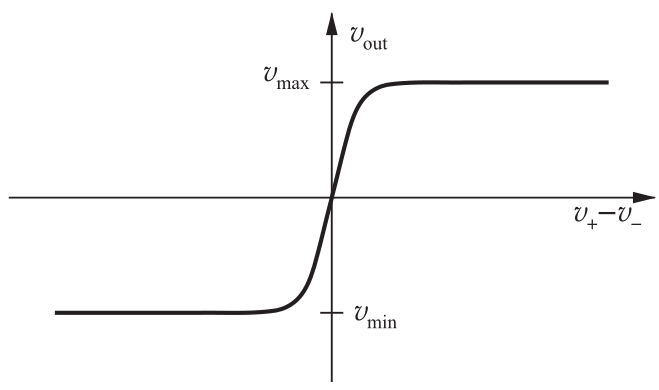 图4.8 运放的输入/输出特性。差分输入为 v + -v -。 在0附近的小范围内,输出电压是输入的线性函数(饱和值为 v min 和 v max )。在线性工作区,运放具有很高的增益