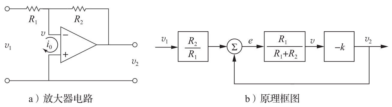 由此得到如图4.9b所示的原理框图。该原理图清楚地表明,这个系统存在反馈,且从 v 2 到 v 的增益为 R 1 /( R 1 + R 2 ),这也可以从图4.9a的电路图中得到。如果回路是稳定的,且放大器的增益很大,那么误差 e 就很小,因此有 v 2 =-( R 2 / R 1 ) v 1 。请注意电阻 R 1 同时出现在框图的两个方块中。这种情况在电路中很常见,这正是框图有时不能很好地适用于某些物理建模的原因之一。