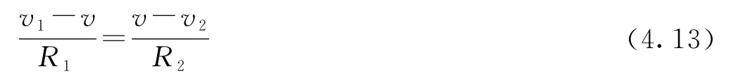 给图4.9a所示的反馈放大器建立框图是有指导意义的。为此,将具有输入 v 和输出 v 2 的单纯放大器表示为一个方块。为了完成框图,还要对 v 与 v 1 和 v 2 之间的依赖关系进行描述。从式(4.13)求解 v 可得: