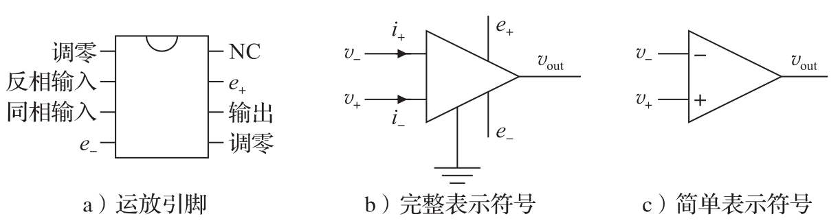 运算放大器(运放)是布莱克(Black)的反馈放大器的现代版本。它是一个通用器件,广泛应用于仪器、控制和通信等领域。它也是模拟计算中的关键元件。运放及其两种表示符号如图4.7所示,它具有一个反相输入端( v - ),一个同相输入端( v + ),一个输出端( v out )。此外还有连接电源 e - 、 e + 的引脚,以及调零的引脚。假定输入电流 i - 和 i + 为零、且输出由以下的静态关系给定,即可得到一个简单的运放模型: