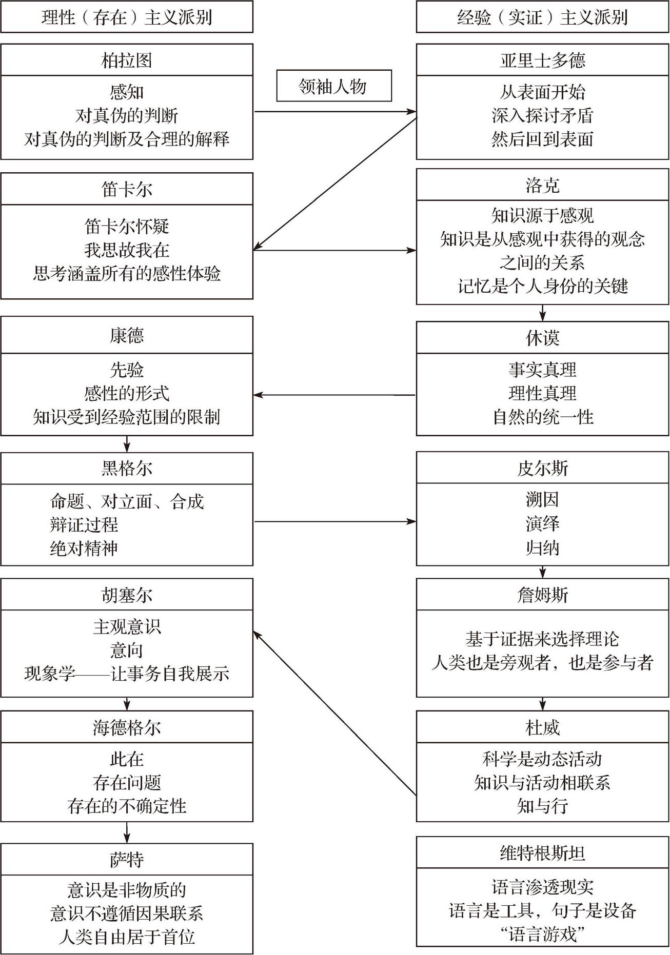 如上所述,西方哲学中有两派伟大的认识论传统。理性主义(Rationalism)坚持认为真正的知识不是感官经验的产物,而是一些理性的思辨过程。按照这种观点,就存在着不需要由感官经验来加以验证的先验知识(Priori Knowledge)。绝对真理是从基于公理的理性推理中推导出来的,数学就是这种推理的一个典型。相反地,经验主义(Empiricism)宣称不存在所谓的先验知识,知识的唯一来源就是感官经验。按照这种观点,世间的万物都具有内在的客观存在,甚至当一个人产生某种幻觉时,他能感知某事物也是有意义的。实验科学是这种观点的典型。