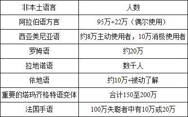 20世纪非洲独立运动后,大量阿马齐格人来到巴黎。依据表3数据,塔玛齐格特语是法国非本土语言使用人数最多的语言,在100万至150万之间,其中三分之二是阿尔及利亚裔,三分之一为摩洛哥裔