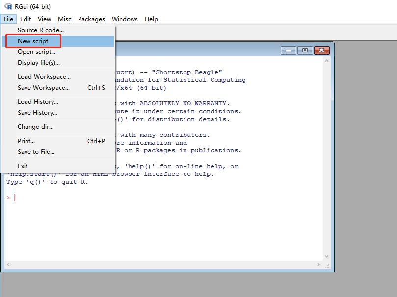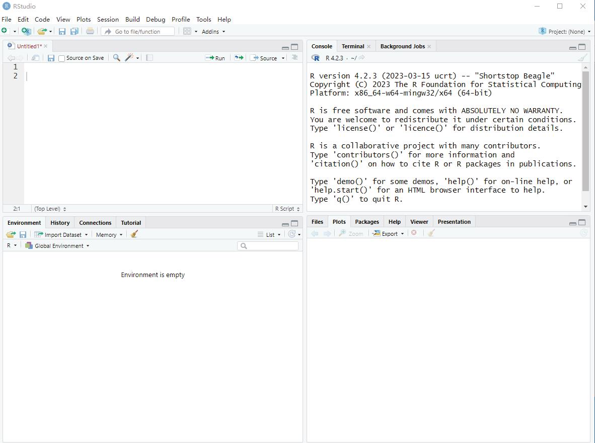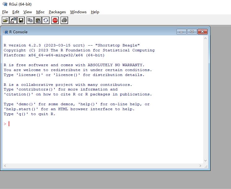 下载之后,打开安装包,然后按照向导进行安装即可。一般而言,把R软件安装在纯英文的路径下可以减少后续不必要的报错。安装过后打开软件,可以看到图2—4所示的脚本对话框界面。